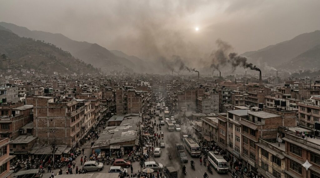 Kathmandu’s pollution is mainly due to vehicle emissions, construction dust, and its valley geography that traps pollutants.